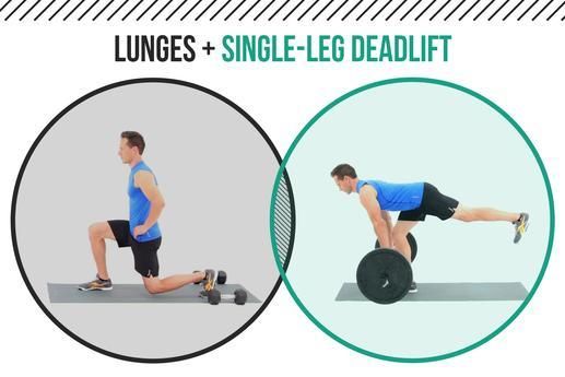 This pair of exercises has the same effect as biceps curls and back rows. You pre-exhaust your hip and gluteal muscles and then balance on the leg that is worked. In other words, a right leg leading lunge combined with a single-leg deadlift. Perform lunges on the right leg and then 30 seconds of a deadlift done slowly. Perform this three times.